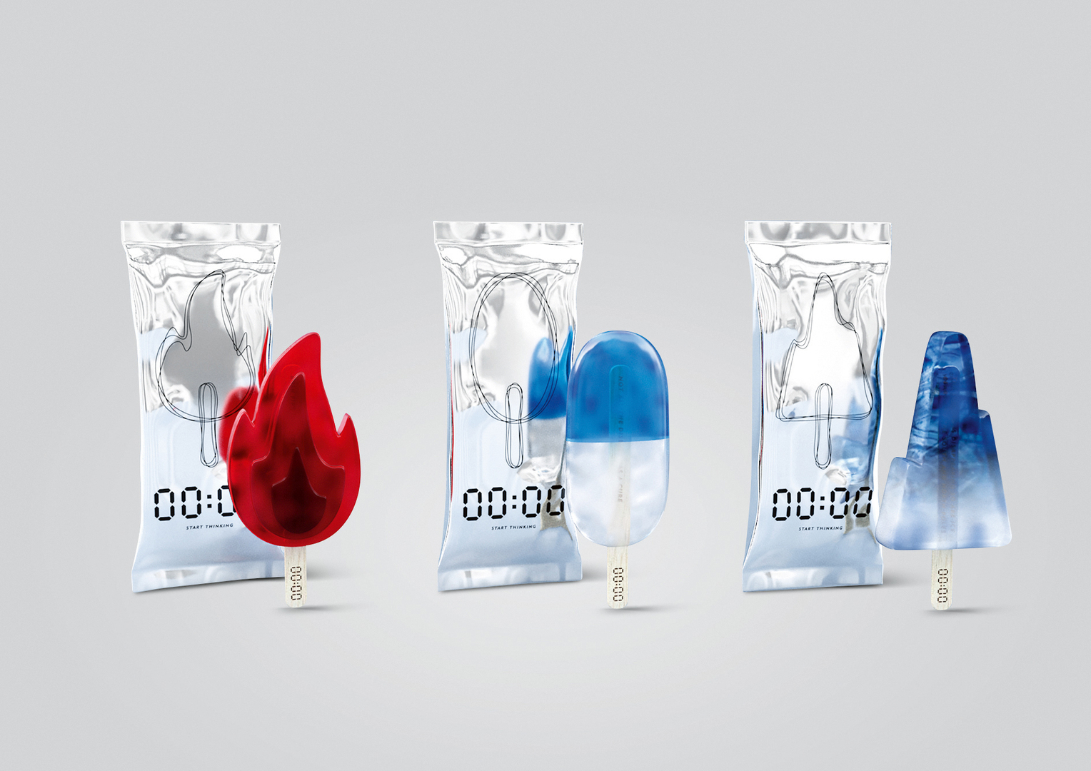 With the appearance of a pill, an iceberg and a flame, these unusual ice cream varieties confront consumers with current challenges posed by germs, glacial melting and forest fires. The message is emphasised by short texts printed on the wooden sticks. The product name “00:00” references a stopwatch. Since the digits indicate both the beginning and the end of a time period, they can be interpreted in two different ways: as a warning that the countdown for planet Earth has already ended or as a reminder that change is needed now to protect the environment.