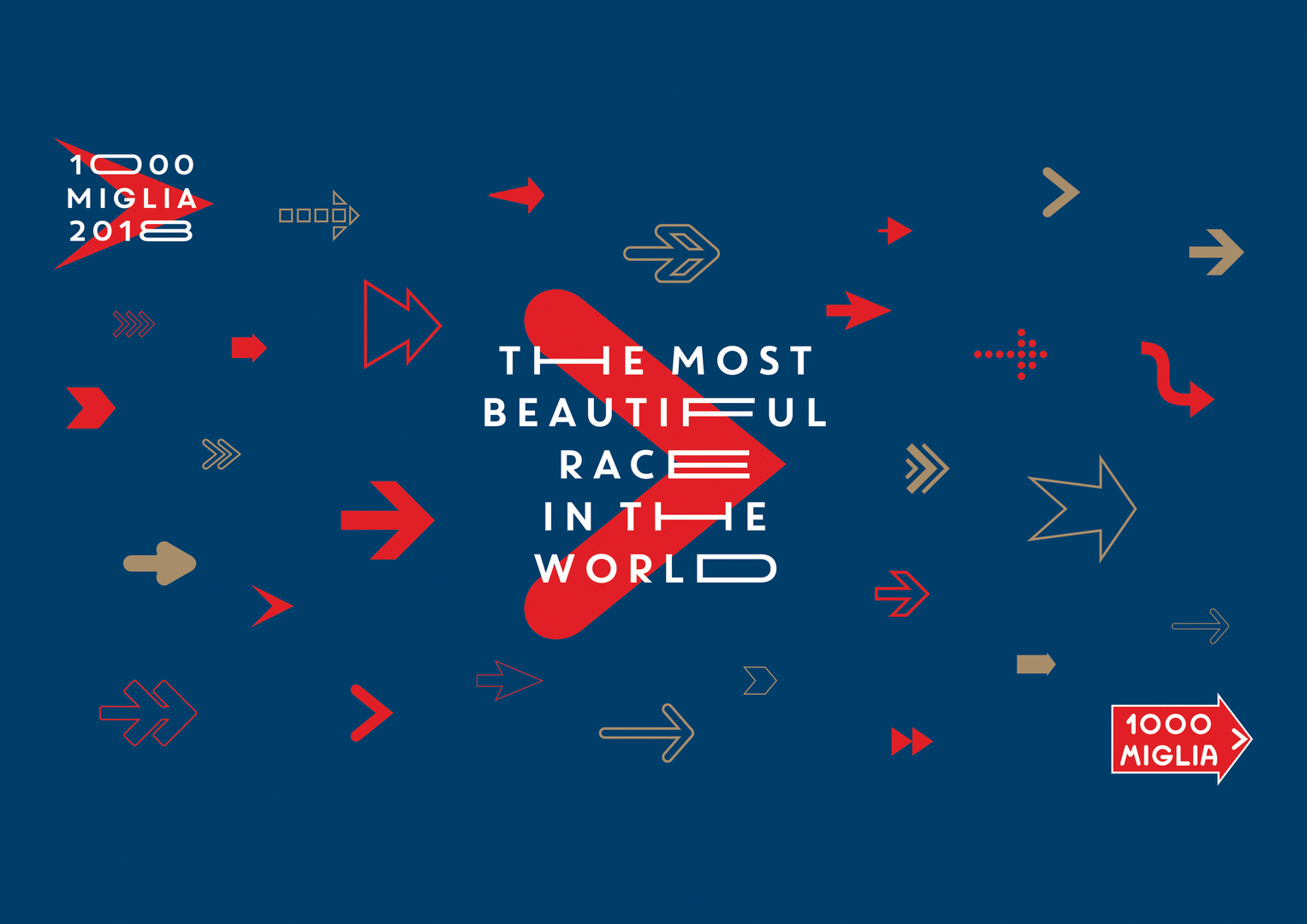 The Italian vintage car rally 1000 Miglia was supposed be redefined to create a lifestyle image for commercial expansion. The new visual identity reflects this, based on the brand’s heritage. A fresh system of arrows, with a style which is softer, more youthful, and abstract, makes it possible to design balanced compositions in which the variety of arrows can be used as singular elements or together to create patterns which offer an infinite number of possible interpretations. The typography conveys a sense of motion, created through the slightly elongated and flattened shape. Furthermore, the combination of the original red and white colour with the contemporary shade of blue creates, along with gold embellishments, an elegant look.