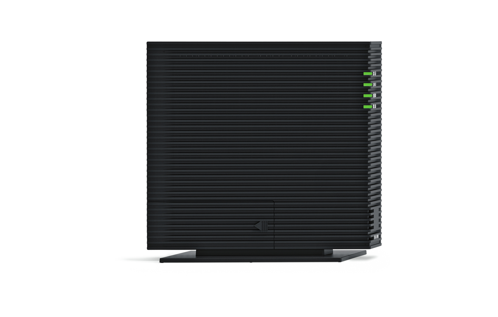 The optical network unit for ultra-high-speed fibre communication is used to connect outdoor optical fibres to an indoor network. The unit achieves a maximum speed of 10 Gbit/s for uplink and downlink. Regular fins form the surface of the unit. They effectively dissipate heat and foster a distinctive aesthetic that underlines the unit’s strong performance. The display panel with light-emitting diodes is drawn over an edge and is thus visible from multiple sides. The unit can be placed upright or mounted on a wall.