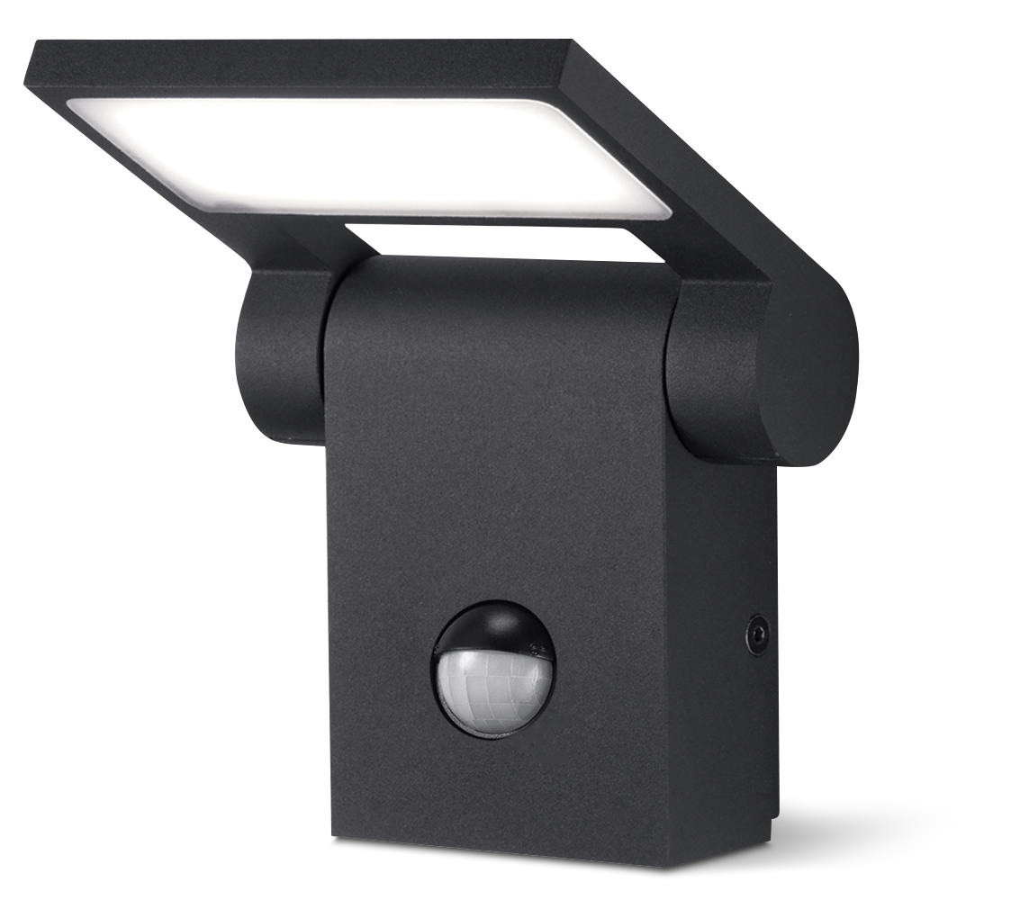 This outdoor wall lamp is made of graphite-grey aluminium and is equipped with a movable arm, which makes it possible to adjust the lamp head up- and downwards in a flexible way. The lamp comes with high-quality LEDs that give out a pleasant bright light. The built-in motion sensor has a range of 10 metres and a detection angle of 120 degrees. In addition, the duration of the lighting period can be adjusted from five seconds to eight minutes.