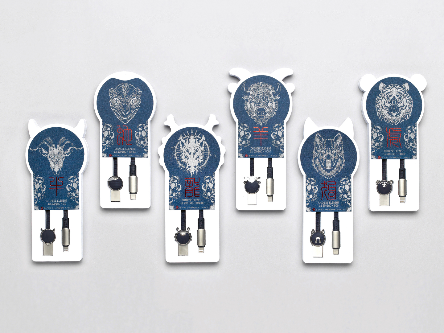 This packaging design with contours representing the heads of zodiac animals allows consumers to intuitively select their own zodiac-inspired products. The charging cables are housed in white cardboard boxes that are shaped like a mobile phone with the heads and ears of the various zodiac animals, lending the boxes a cute look. The use of ancient Chinese characters as pictographic illustrations aims to impress consumers. The design with blue and silver patterns echoes the memory of folk batik fabrics of ethnic minorities in China.