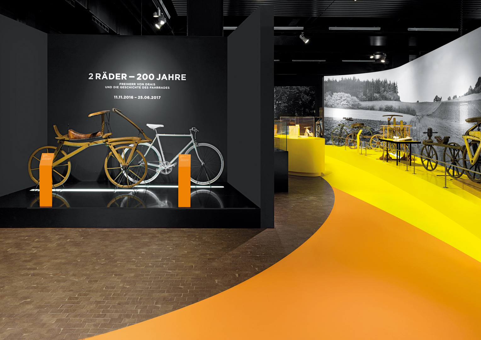 To mark the 200-year anniversary of the first “Laufmaschine” (forerunner of the bicycle), the regional exhibition of Baden-Württemberg at the Technoseum in Mannheim, Germany, tells the story of the bicycle. Visitors are guided to the exhibition entrance by an installation of flashing reflector lights. The special exhibition is designed as a colourful bicycle path that leads through the different decades of bicycle history. Along the way there are different rooms to be discovered, each featuring large atmospheric panoramas of the various time periods, as well as open spaces with viewpoints on the scenery revealing interesting perspectives. As a scenographic highlight at the halfway point, the path evolves into a steep, three-dimensional curve. Besides presenting futuristic perspectives and concepts the “tour” ends in an alternative bicycle repair shop with the “Singlespeed”, todays equivalent to the “Laufmaschine”.