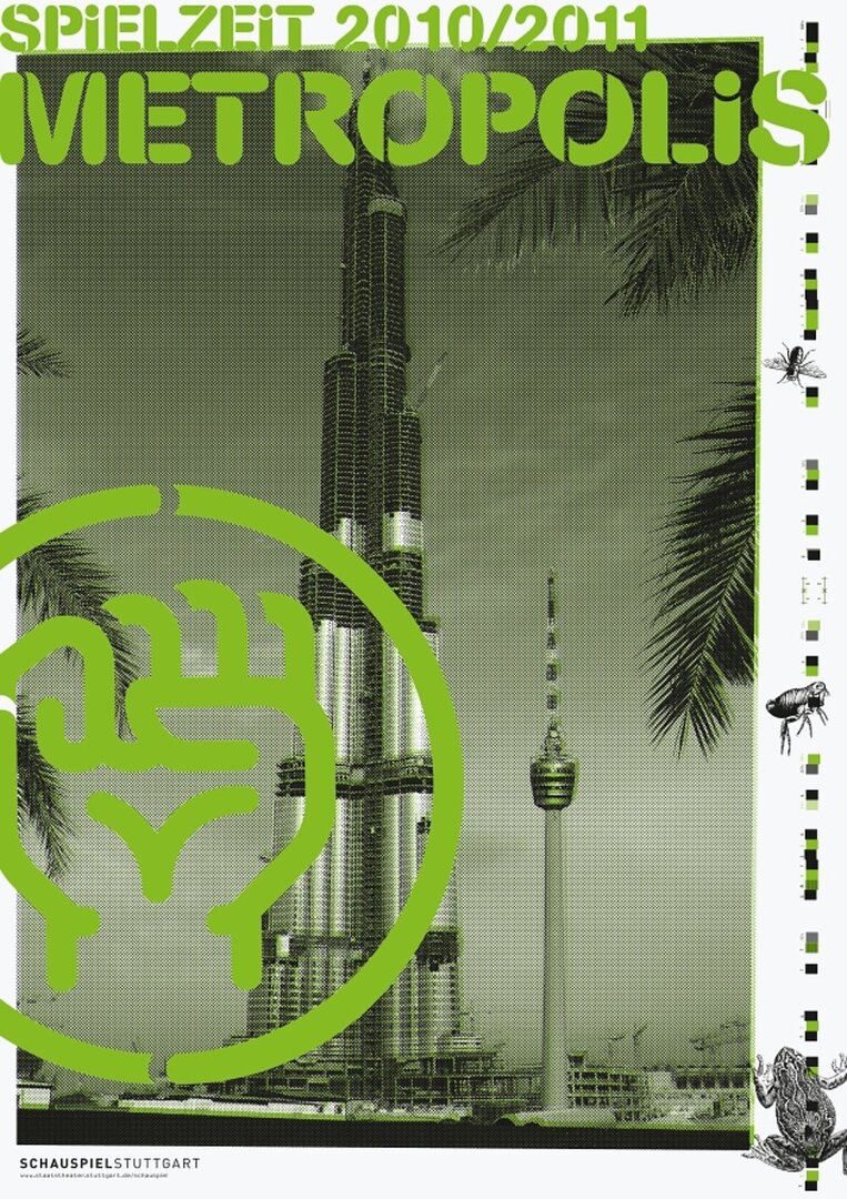 The classic movie Metropolis, number one topic of the season 2010/2011 of the Schauspiel Stuttgart, is closely related to Stuttgart 21. Ten posters combine themes of the film, the corresponding repertoire of the Schauspiel Stuttgart, and scenes from the city in an off-theatre look and position the theatre in the centre of the controversy over a liveable city. Without using polemics or catchwords, the state theatre presents itself in a differentiated way and still sets a clearly visible sign with its revised logo, a neon-green clenched worker’s fist.