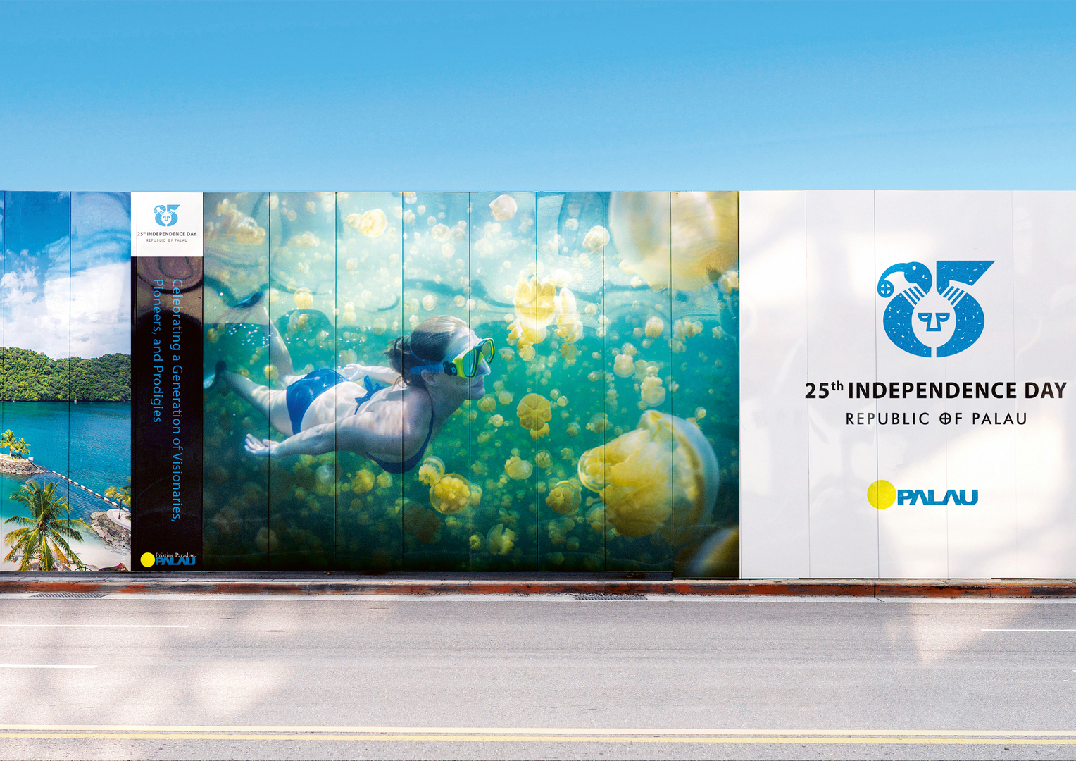 A distinctive brand identity was created to celebrate the 25th anniversary of Palau’s independence. The design for the event was based on the archipelago’s cultural and historical background: in the Republic of Palau, the mythical bird Delerrok represents good luck, pride and prosperity, while Chedechuul is the god of construction and repels evil spirits. The logo depicts these mythical creatures in an illustrative style typical of Palau. In addition, the design concept uses tribal totems, symbols of nature and famous sights, a maritime image language, as well as the national colours of blue and yellow, which represent the ocean and sunlight.