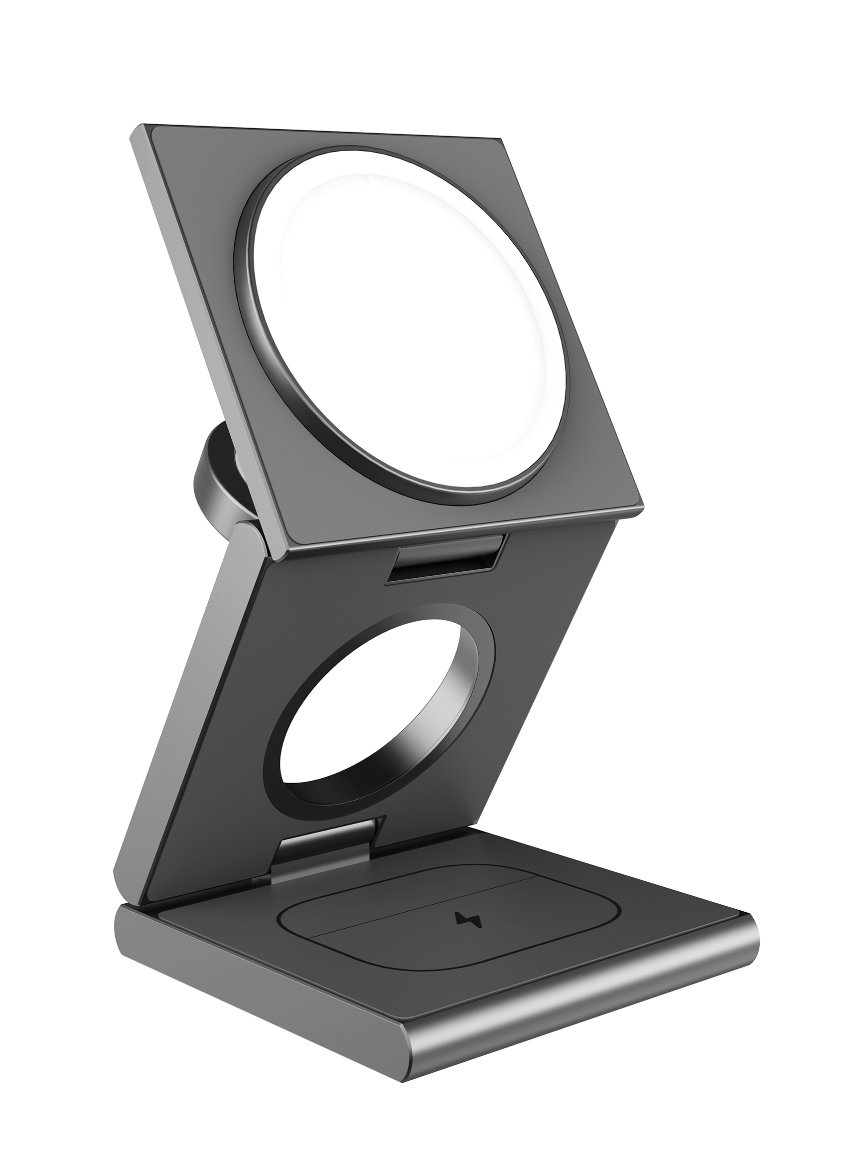 This foldable, portable 3-in-1 wireless charger features magnetic auto-alignment for easy charging. It offers various modes of use and an adjustable-angle stand design that enhances user convenience. Crafted from recyclable aluminium alloy with precision CNC machining, it combines comprehensive charging capabilities with an integration of design, material craftsmanship, and functionality.