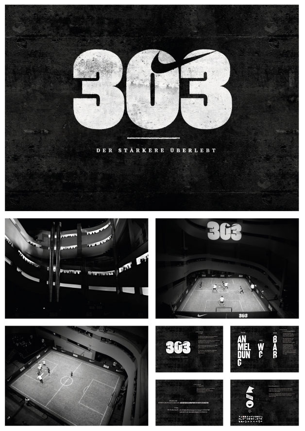 In 2010, Nike Football hosted a series of unusual urban football tournaments under the motto “3o3 – Der Stärkere überlebt” (3o3 – Only the strongest survive). The motto is based on the fact that “3o3” not only means “three against three” but, in the slang of American street gangs, also means “law of the jungle”. The kick-off event for the matches, which were played at night, took place in an abandoned car park in the inner city of Munich. 30 teams could register for the first 3o3 tournaments and design their jerseys themselves. The announcements and the activation of the teams happened exclusively through Nike Football’s Facebook profile.