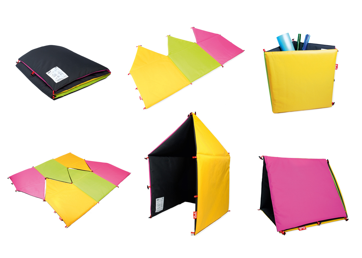 Whether used as play blanket, house, hiding place or storage space for toys – the 3k textile object offers a variety of applications. Practical and playfully easy to convert, it stimulates children’s creativity and, thanks to its easy handling and low weight of only 2.7 kg, is also suitable for bringing on journeys. It allows at least six different configurations, with the individual polyester elements utilisable from both sides.