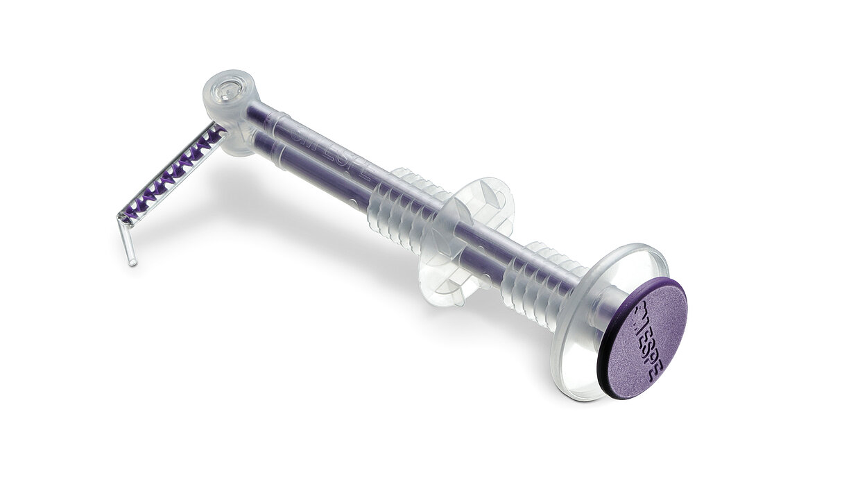 This retraction capsule was developed for the artificial retraction of gingiva from the tooth neck. By using contrasts of matte and glossy surfaces, but also relief-like height differences, it renders the impression of a high-quality product at first glance. The cylindrical shape with rounded edges provides pleasant haptics and a well-controlled grip. The asymmetric fin underlines the friendly character of the capsule. Upon retraction, the tapered and elongated capsule tip can be easily inserted into the sulcus without injury. The conical geometry allows for easy mechanical displacement of the tissue. In addition, the attached orientation ring simplifies precise intra-oral handling.