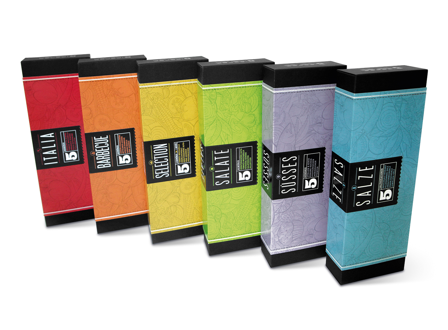 Inspired by the versatile world of spices and herbs, this unique product design originated with great care for details: the herb and spice blends are manually placed in re-sealable jars and enclosed in fine paper boxes refined with hot foil stamping and blind embossing. Each of the five spice and herb kits is dedicated to a culinary topic: Salts, Salads, Italy, Sweets and Barbecue. Both the numbering and the colouring of the individual boxes included in each collection help consumers to differentiate between the various products. Moreover, each spice comes with an inspiring recipe suggestion.