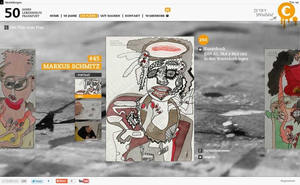 On the occasion of the 50th anniversary of the Lebenshilfe für Menschen mit geistiger Behinderung (Help for people with mental deficiencies) in Frankfurt/Main, 11 artists from the in-house studio Atelier Goldstein participated in a jointly developed campaign. By painting over the floor plan of Gut Hausen, an area of 2.8 hectares in the heart of Frankfurt/Main, the artists painted their individual visions of the future. The website of the campaign presents all 50 works and shares the development process with the users via video.