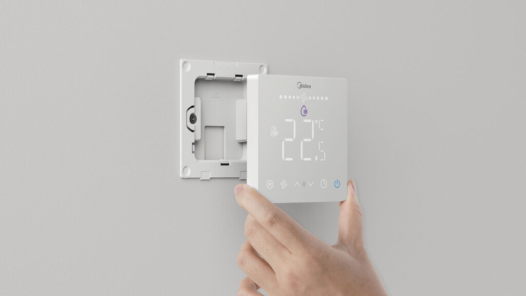 The 86F wall thermostat is characterised by its flat casing with rounded edges and is available in three colour variants. In addition to the temperature, the frameless touchscreen display shows the different operating modes, which can be intuitively understood thanks to the colour-coded symbols and enable quick orientation. The dynamic fan symbol visualises the current air circulation. An integrated algorithm analyses the indoor climate and helps to reduce energy consumption by making automatic adjustments.