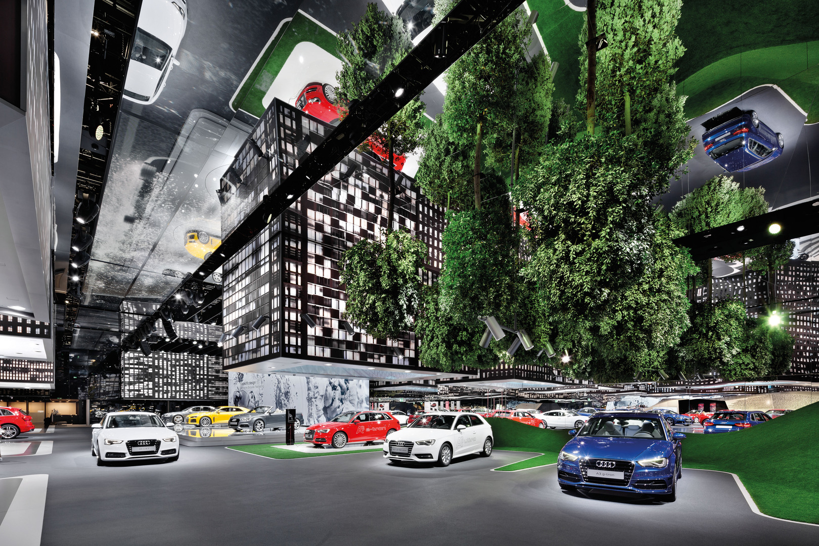 This fair stand fascinates with the consistency employed in turning the motto of a change in perspective into a visual concept. Visitors beholding the real-time simulation of the high-tech metropolis get the impression that it is hanging. This effect is highly captivating and more than just another showcase of technology, it embodies the thoroughly designed realisation of a theme.