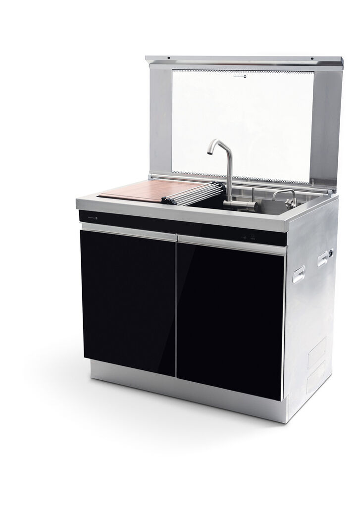 A1 is a sink which is integrated into a kitchen unit and can be closed with a cover when not in use. Thus, an additional worktop is created and kitchen space can be used flexibly. The handmade stainless steel sink was designed for the Asian market and is equipped with useful accessories. Innovative features such as a small electric kettle, a water filter and a waste processor complement the operating concept.