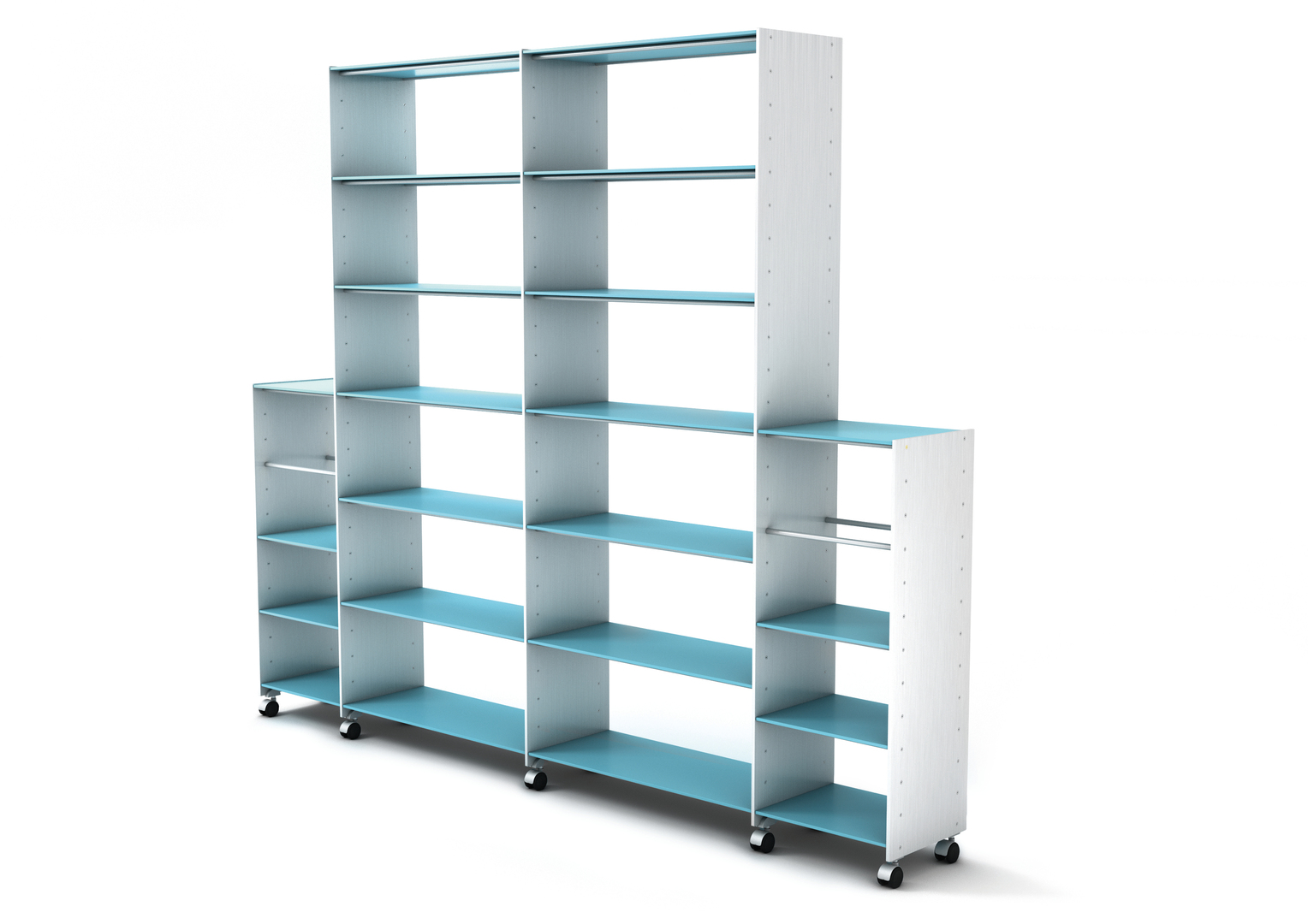The dimensions of the AAndres Eileen & Frank modular furniture system are based on the Golden Ratio. The shelf boards and cross bars can be mounted in any combination and there are six different heights, five different widths and five different depths with fixed spaces of 8 cm. The system’s luxurious, hand-finished surfaces are made of a specially cast aluminium alloy, which shows very low vibration. The extremely slim shelves, made of high-quality materials, seem to float between the aluminium partitions. All structural elements that contribute to the stability of the system have been moved inside, in order to make all visible elements very thin. All the connecting parts are made in-house. Only the drawer fixings are standard furniture industry supplies. Furthermore, the system’s low-emission production methods and the fact that all parts can be recycled separately ensure to a high degree that they are not harmful to the environment.