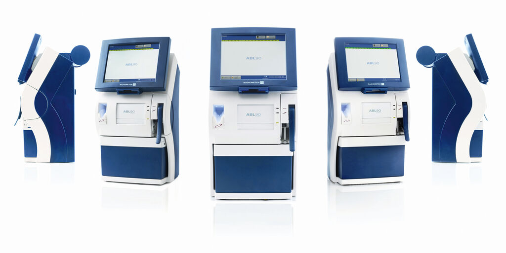 The ABL90 Flex analyses blood samples from critically ill patients, a procedure that is often essential for their survival. It provides fast and precise results based upon extremely small blood samples. The technological innovation behind this device is its unique sandwich thick-film board construction which has replaced the separate measurement electrodes. The input areas of the blood gas analyser are ergonomically shaped and visually connected through the curved side panel.