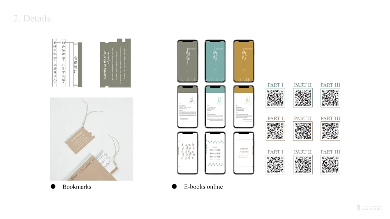 The pastoral poem is a genre of Chinese poetry which is characterised by images of nature and a peaceful spirit. This publication contains 24 pastoral poems by poets who lived more than a thousand years ago. The process of cultural inheritance is represented by three versions of each poem: a traditional Chinese version, which is printed on handmade bark paper with a retro-style font, a simplified Chinese version on rice paper with a specially designed font, and an English version on modern paper. The dwindling luxuriance of the pages effectively illustrates the point that something poetic may have been lost in translation.