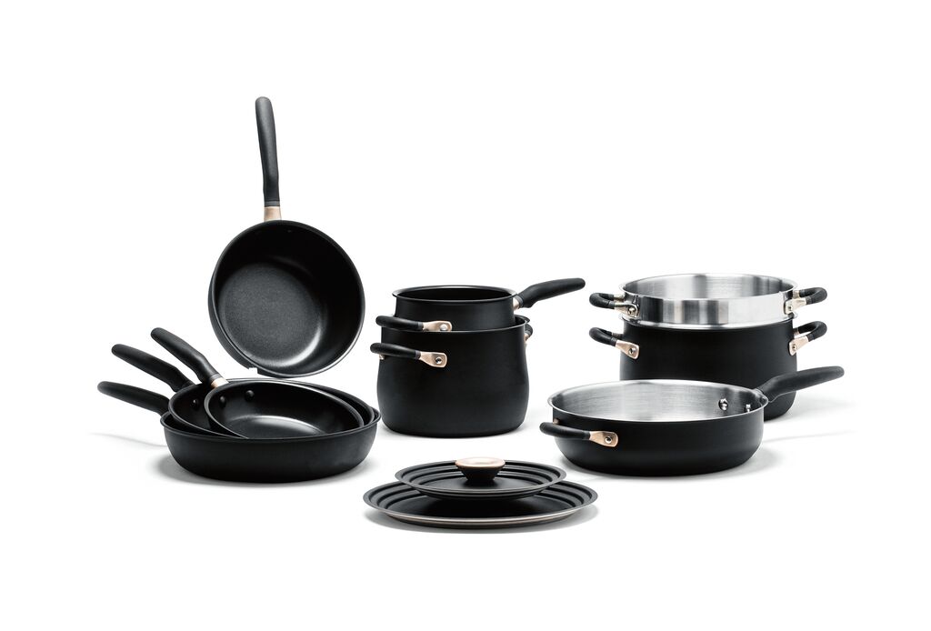 To enable space-saving storage, this cookware is stackable and comes with patented lids in just three sizes that fit the entire range. The contour of the pots tapers towards the top to prevent food from boiling over, while the curved rims also minimise drips running down the sidewalls. Ergonomically-designed silicone handles and non-stick induction bases round off the qualities of this dishwasher-safe cookware.