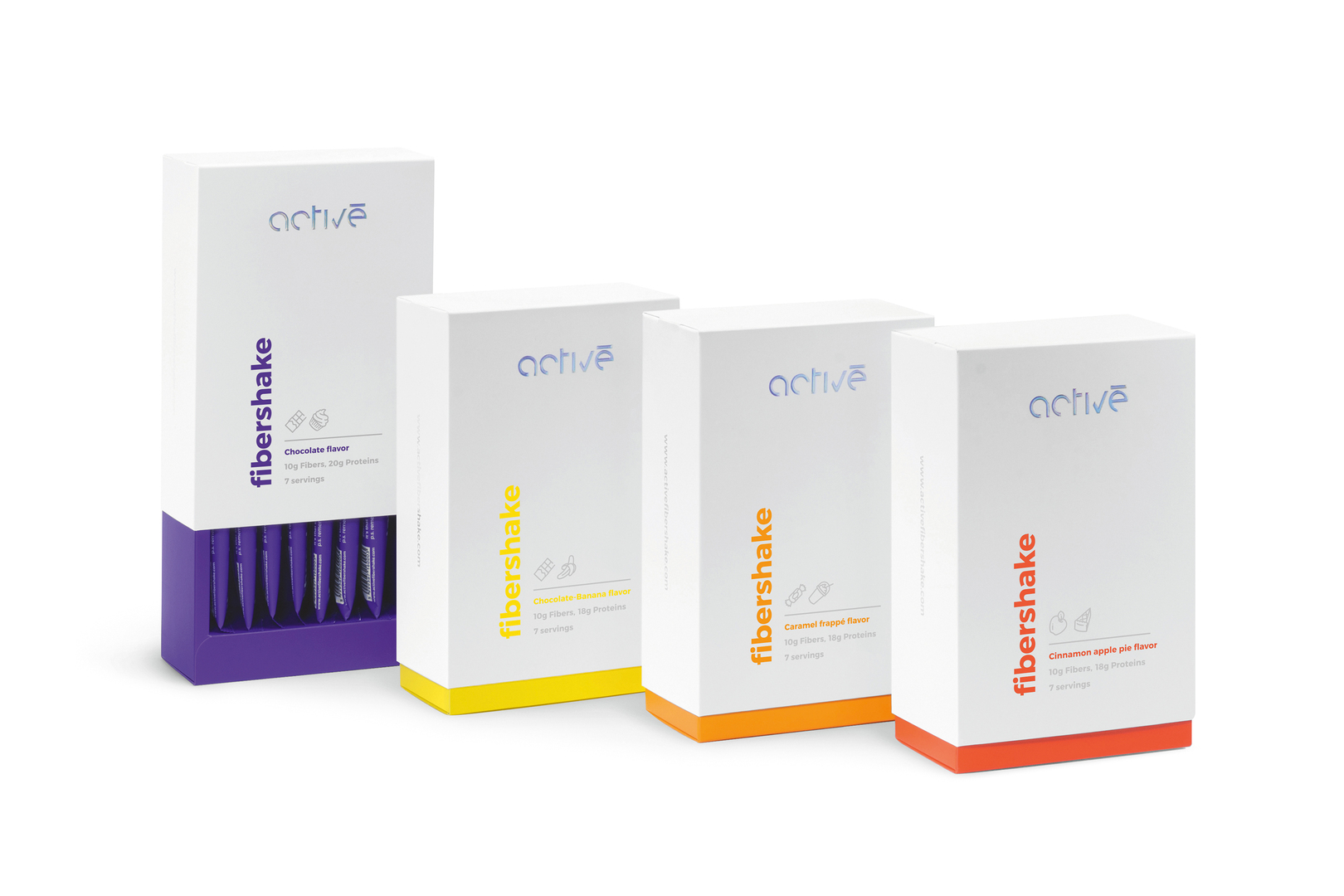 The packaging design of the activé FiberShake combines functionality with clarity. This naturally sweetened prod-uct packed in individual portions can be prepared quickly and offers a long feeling of satiety. Users simply shake the powder with water or milk, and then after four minutes it turns into a delicious pudding. The packaging of the bag features a design with strong colours, while the various flavours are also marked in distinctive hues on the outer packaging. For instance, purple refers to the flavour chocolate and black stands for vanilla.