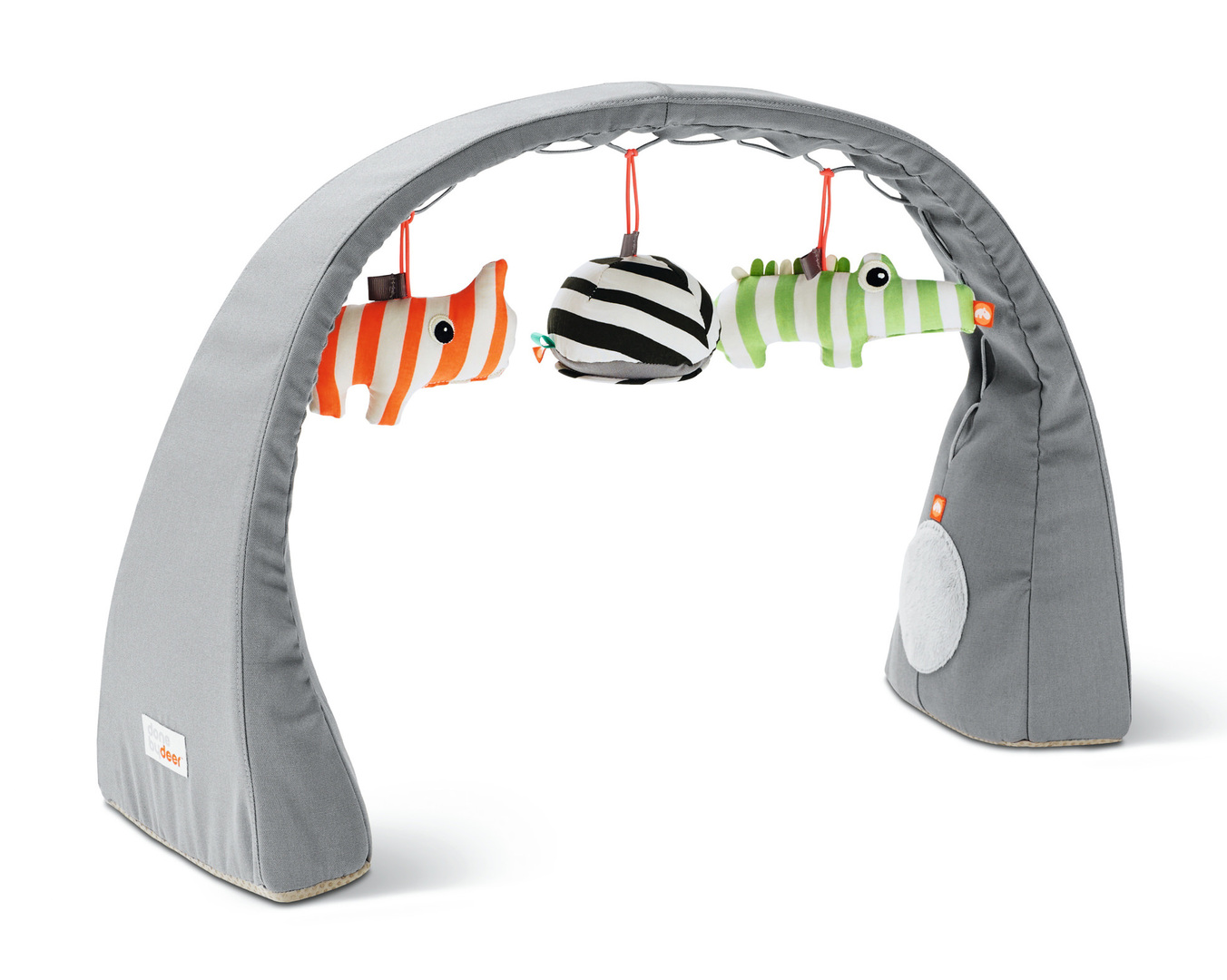 The Done by Deer Activity Gym is made of soft material and stands freely. By moving the feet, it can be adjusted in width and height for use in many places and to enable the baby to reach the toys. This activity arch stands out by its simple design and its discreet colouring – slightly broken only by three dangling toys. The toys – a mirror, a crocodile and a rhinoceros with crackle and rattle sounds – encourage the baby to grasp and stimulate its senses.