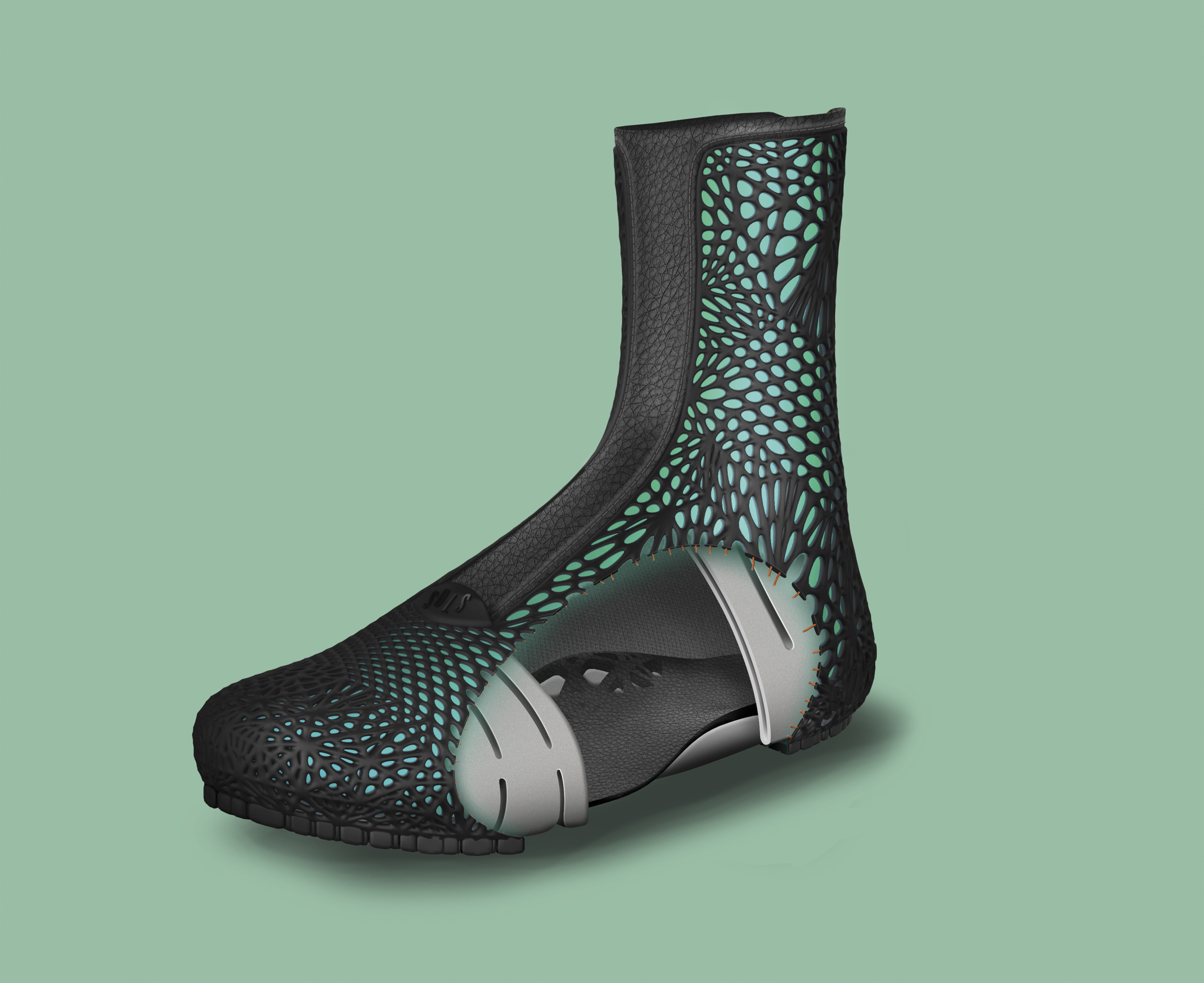 ADAPTIV is a footwear concept created by Leadoff Studio for 3D printed orthotic manufacturer, SOLS. The design looks at the potential evolution of SOLS technology in combination with other advances in fields like soft-robotics and printed circuits to create a fully 3D-printed shoe – one that is possible 5 to 10 years into the future. ADAPTIV is built uniquely to the foot’s strategic biological point locations and dimensions. Beneath the exoskeleton is a layer of 3D printed silicone airbags with pressurised air which shifts to protect and provide comfort for the wearer’s feet as they move. It also houses a series of sensor functions that measure the foot and body’s movements in real time and adjusts the boot to fit accordingly. ADAPTIV’s capacity for instant adaptability means that one’s footwear will constantly adjust itself to the body’s shifts and motions to prevent injury and maximise comfort. Leadoff Studio created the concept to be presented at an event hosted by Carmelo Anthony around the NBA All-Star Weekend, coinciding with Fashion Week.