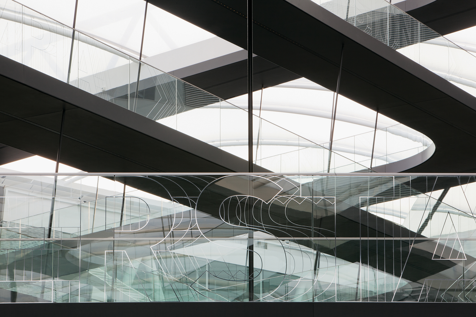 A metaphor of laces is the key element throughout the entire architecture of the adidas building, capturing the essence of sport: constant movement. A “moving” typography runs through the new adidas centre and is also reflected in the typeface of the signage system. Swift and light, the font leaps and bounds across walls and balustrades, its form vibrating and altering in the process. Words identify places, translating into coloured surfaces, reliefs and sculptures. In the meeting areas on the upper floors, the white lettering appears to have been frozen mid-movement, forming a mural relief. On the glass balustrades of the high walkways that criss-cross the interior of the building, the letters look as if they had been stamped from super-fine, transparent gauze.