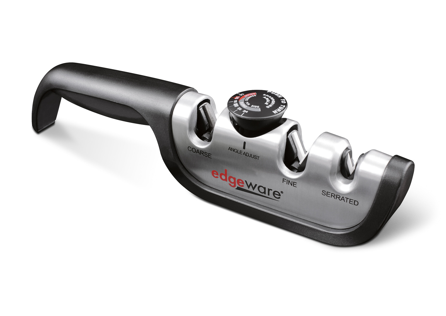 With this manually adjustable knife sharpener it is possible to adjust the grinding surface quite simply so that every knife can be sharpened in the grinding angle originally set by the manufacturer. This way there is less metal abrasion. The knife sharpener has three grinding slots: one with ceramic rods for light re-sharpening, one with diamond for sharpening blunt or damaged knives as well as one with serrations for a serrated blade.