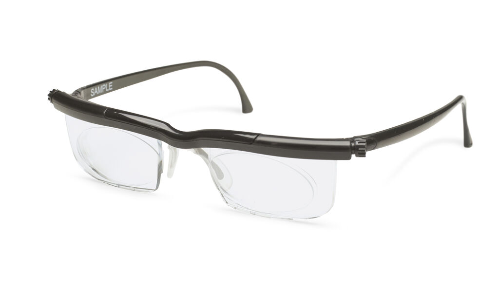 In these distinctive glasses, the corrective power of the polycarbonate lenses is continuously adjustable via small rotating wheels. Two wave-shaped plates in each lens glide across each other and allow adjustments from –6 to +3 dioptres, correcting more than 90 per cent of spherical errors. With a simple construction, these glasses are suitable as a spare pair and for patients with fluctuating vision, such as due to diabetes or after eye surgery.