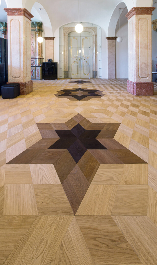 The immense variability of the Admonter Rhombus parquet is impressive. The choice of high-quality materials creates a both natural and refined ambiance.