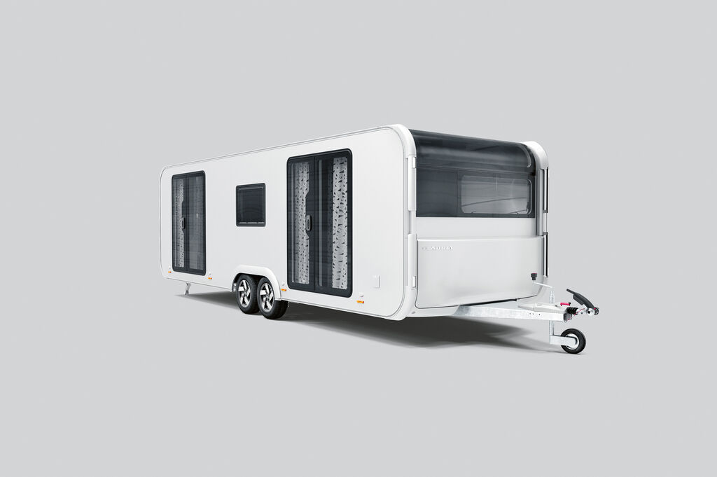Astella is a caravan and mobile home in one which has been designed for the luxury segment. Clear lines and a reduction to the essentials characterise its elegant, aerodynamically optimised appearance. Innovative panorama doors and windows merge the interior and exterior. Inside the caravan, generous open spaces, a spa-style bathroom, a designer kitchen, connected living elements and a quiet, well-organised interior create a luxurious atmosphere.
