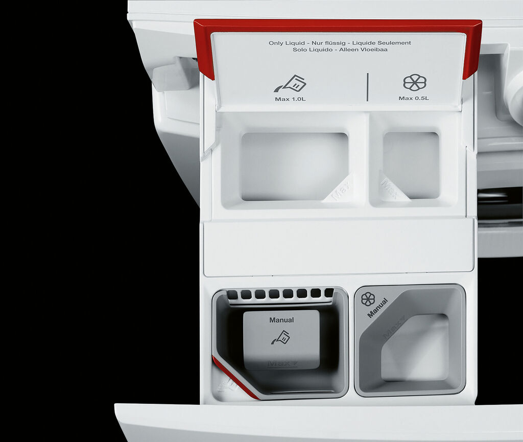 Autodose is a detergent drawer with an automatic dosage system. During the washing process, a sensor measures the weight of the current laundry load and ensures that the correct amount of detergent is added, and thus effectively prevents overdosing. If required, the device also allows flexible, manual dosing. Symbols and terms which are easy to understand as well as the colour-code of the compartments facilitate intuitive handling.