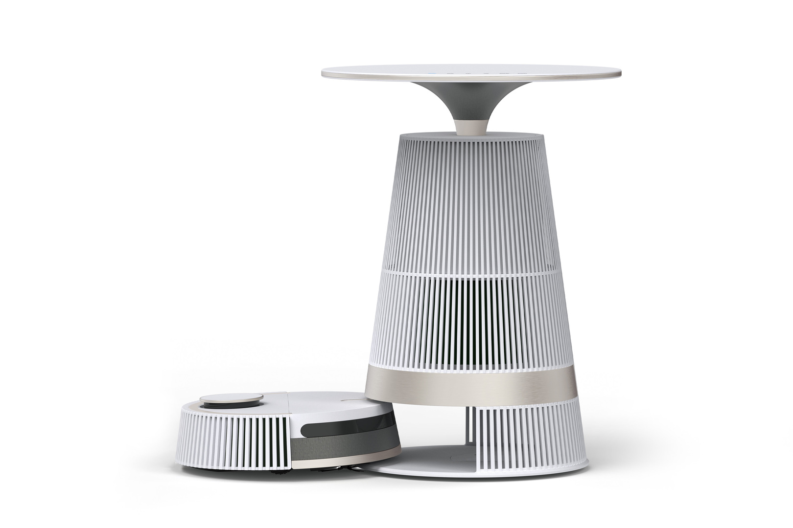 Aero Table connects the morphological and functional features of product and furniture and embodies the aesthetic concept of spaciousness. It functions as a robot cleaner, air purifier, and side table, but its philosophy of cleanliness extends beyond cleaning air and dust to a visually and aesthetically clean and “empty” space. Aero Table cleans like a house-elf when the owner is away and returns to its original intended location when the owner returns home to rest. Aero Table then cleans the air using the existing motors mounted on a robot hoover cleaner and clean station, ensuring that the product is not purposeless in any situation. By incorporating multiple values into a single product, Aero Table reduces unnecessary waste of resources. Designed with meaningful aesthetic, the robot cleaner improves the quality of life of users even when it is not in use, instead of just taking up space. Aero Table also communicates information through mood lights and speakers integrated into its table surface, providing an added sense of atmosphere. Red Dot Award: Design Concept | Concept | Domestic Aid and Home Appliances