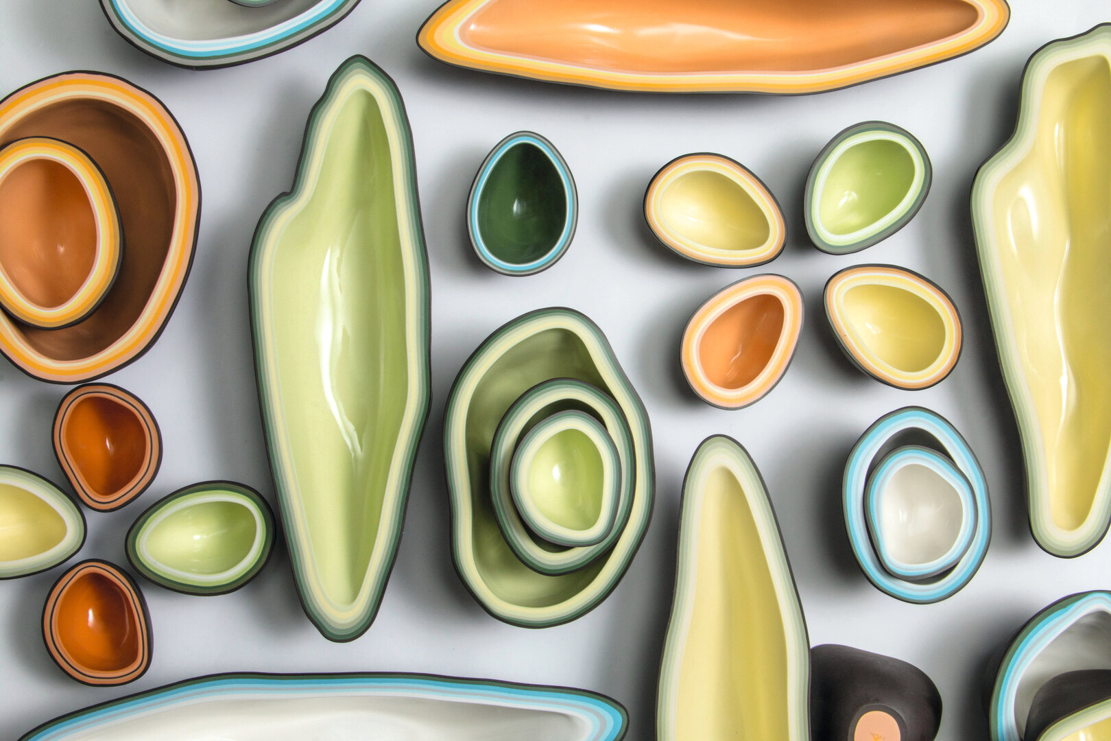 An asymmetric design language paired with a great diversity of colours lends these ceramic bowls their decorative character.