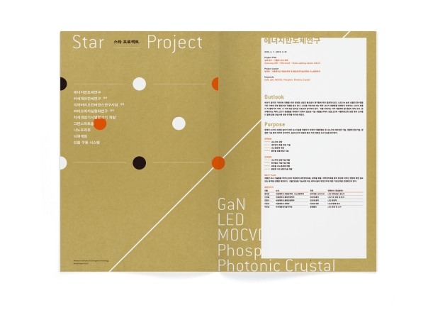 The design of the annual report for the AICT, the Advanced Institutes of Convergence Technology in Korea, combines the acronym of these institutes with the year of publication into a motif that is reminiscent of the shape of chemical compounds of various elements. This immediately visualises what the science institutes’ research focuses on and illustrates the fact that AICT is an umbrella name for different institutes in various fields of research such as nanotechnology, IT and biology. The reduced and modern design with coloured circles, lines and diagonals visually marks the reference to natural sciences which is also on the inside of the report, and emphasises the high demands placed on environmental sustainability by the advanced research institutes through the selection of recycled paper. The content is thus presented in an unpretentious and clearly arranged layout.