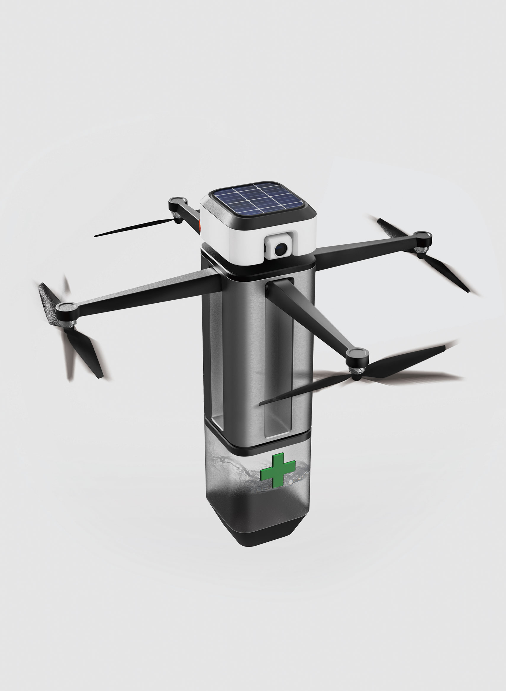 Aid-Wing sets new standards for disaster relief and quarantine programmes by effectively disinfecting a designated area even in inaccessible locations. The drone's precision in dispensing quarantine fluids minimises secondary damage while eliminating the need for humans to undertake the hazardous task. Equipped with solar panels and a 360-degree high-performance camera, it enables sustained use while monitoring the surrounding situation in real-time. Red Dot Award: Design Concept | Red Dot: Next Gen Award | Concept | Cameras, Drones and Camera Equipment