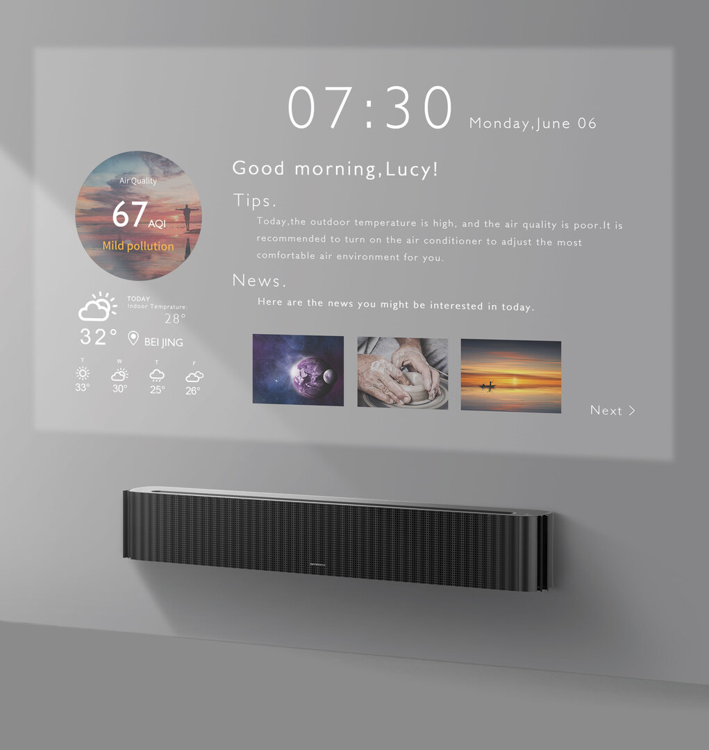 In the home, Air Bar serves as both an air-conditioner and a projector. This design concept is a space-saving solution for small spaces and helps a space maintain a minimalist aesthetic. As an air conditioner, Air Bar has two unique air louvre designs. The front air louvre has a micropore design (made from 4512 micropores). Airflow is released through the micropores to form a windless feeling, providing a more comfortable wind sensation. On the sides, two air louvres provide a wider ‘sweep’ angle with four rotatable swing louvres, and is able to ‘sweep’ air across a wider area. The combination of the two different air outlets provides the user with a comfortable 360° surround-air feeling. An air inlet grill is located at the base of the product to minimise the accumulation of dust. As a projection device, Air Bar displays the operation interface of the air conditioner, creates a platform for sharing information with the family and functions as an assistant for daily life. The projection interface displays air humidity, temperature, real-time status of indoor and outdoor weather, daily work reminders, and more. Users can watch a movie together with friends and families in the living room while enjoying the comfortable air-conditioned environment at the same time. Red Dot Award: Design Concept | Concept | Domestic Aid