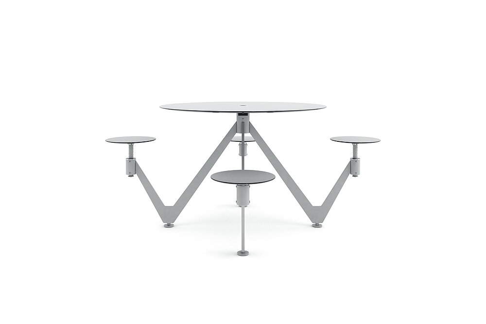 Air-Circle is the name of a collection of round tables with integrated stools that are suitable as street furniture for outdoor use. The supporting structure of this unit has been fashioned from strong, powder-coated sheet steel. The tabletop and seats are made of high-pressure laminate and are attached using tubular joints. The minimalist-looking furniture is available in two versions: a four-seater with two height-adjustable stools and a six-seater with three.