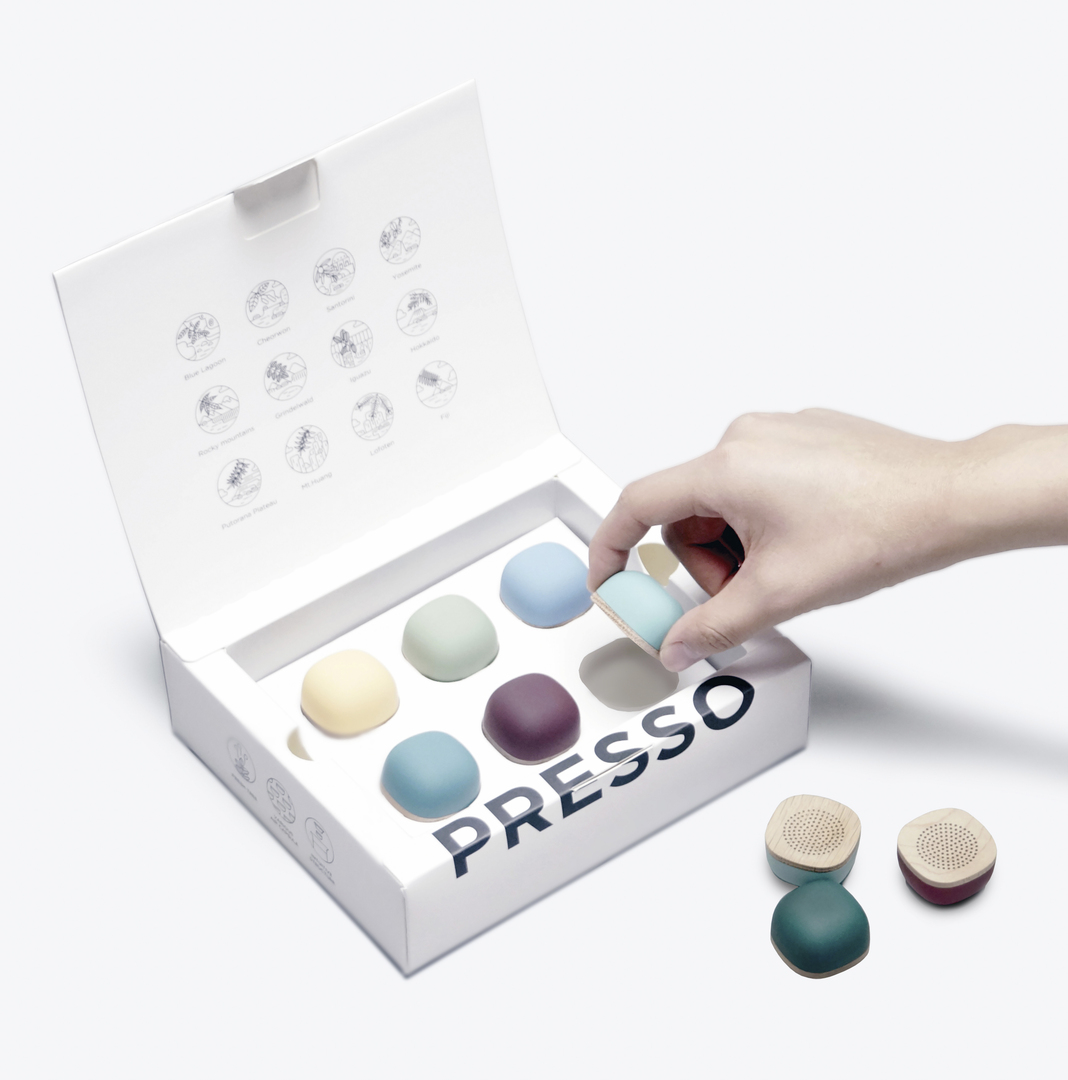 Bringing the world’s finest air to your room, getting fresh air with the Airpresso is as easy as brewing a cup of coffee with an automatic coffee maker. The appliance releases different concentrations of oxygen from a capsule to bring about a desired natural environment to a space. The capsules are classified according to the oxygen concentration to provide 3 modes of fresh air – “recovery”, “comfort” and “sleep”. Users simply choose a capsule, open the cover of the air dripper, drop the capsule in and touch the power button. A high-molecular substance that contains a huge amount of oxygen is released when it reaches a certain temperature. Oxygen then exits through a one-way valve and carries the aroma of local wood chip out into the space. With an App, users can monitor how much of the capsule is left, data on air condition in the room and retrieve information about each capsule’s contents and oxygen concentration. The screen on the right also slides out to function as a remote control.