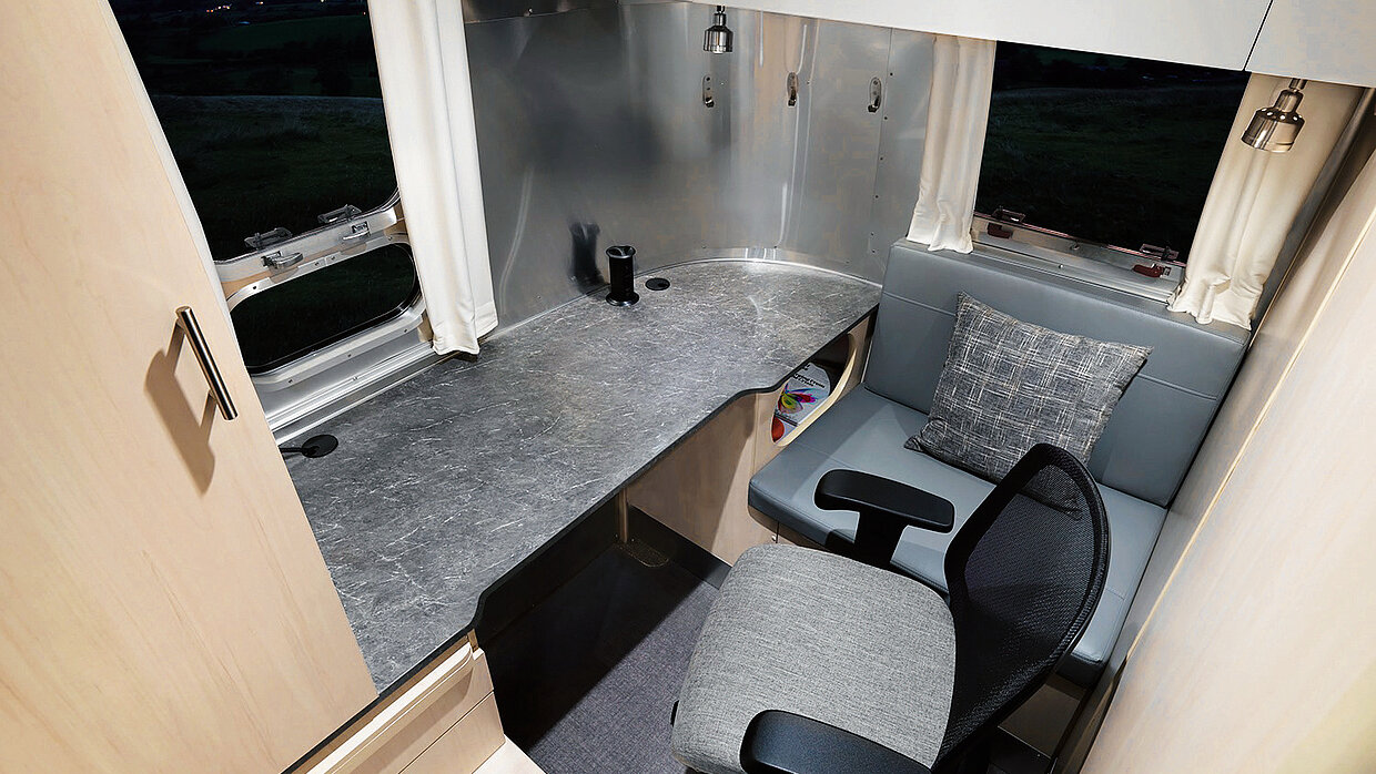 The Airstream Globetrotter 30RB is characterised by its high-quality, minimalist interior design with clear lines, gentle curves and neutral colours. The floor plan places the bedroom in the rear, while the approachable front includes an elegant “wrap-around” lounge with sufficient space for guests. The dinette can be converted into an additional bed.