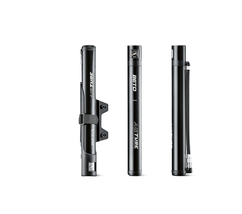 AirTube was developed to facilitate stress-free pumping of bicycle tyres in case of a flat on a trip. It looks like a regular mini-pump but is operated electrically, powered by a lithium battery. When fully charged, it can pump about two 700 × 25 road tyres up to 120 psi or about three 27.5 × 2.5 mountain tyres to 35 psi. A stylish one-inch gauge provides precise pressure reading. It comes with an USB type C charging cable to recharge at any place and any time.