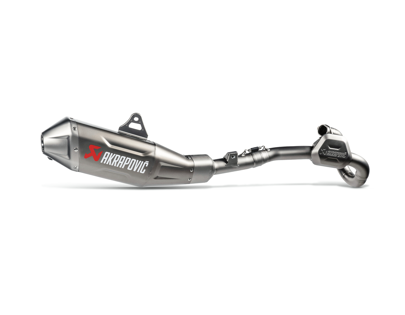 This innovative exhaust system was developed for the Honda CRF450R/RX off-road motorcycle and combines durability with maximum efficiency and high-quality design. An innovative silencer reduces engine noise while improving the exhaust flow. The system provides a deep, full sound and extra strength for coping with off-road racing conditions. Its lightweight titanium construction makes it lighter than the stock system by 26.5 per cent and is finished with a logo imprinted using a special technique.
