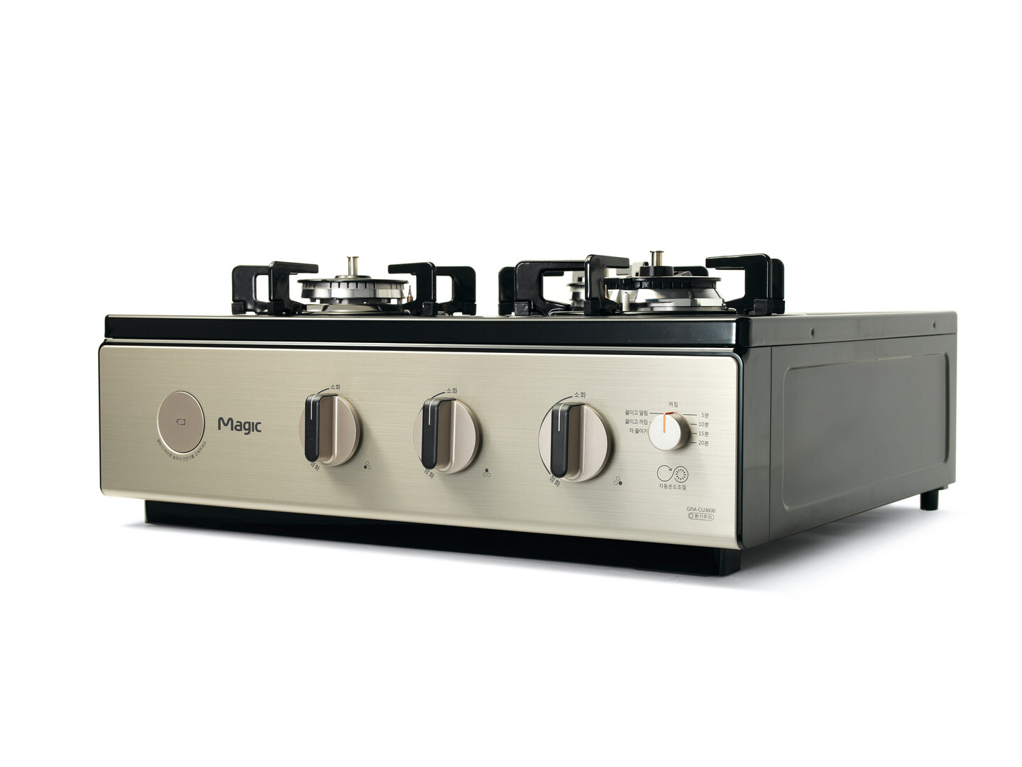 “Alarm Cook” Gas Hob is a free-standing gas cooker for the Asian market. The wide operating panel is made of polycarbonate and treated with a hairline texture. The material is more cost-effective than stainless steel and allows colour variations. By means of a rotary switch, various energy-saving cooking alarm functions can be selected, among them are “alarm after boiling”, “automatic shut-off after boiling” and a timer function. The appliance has a safety sensor and an automatic temperature regulator.