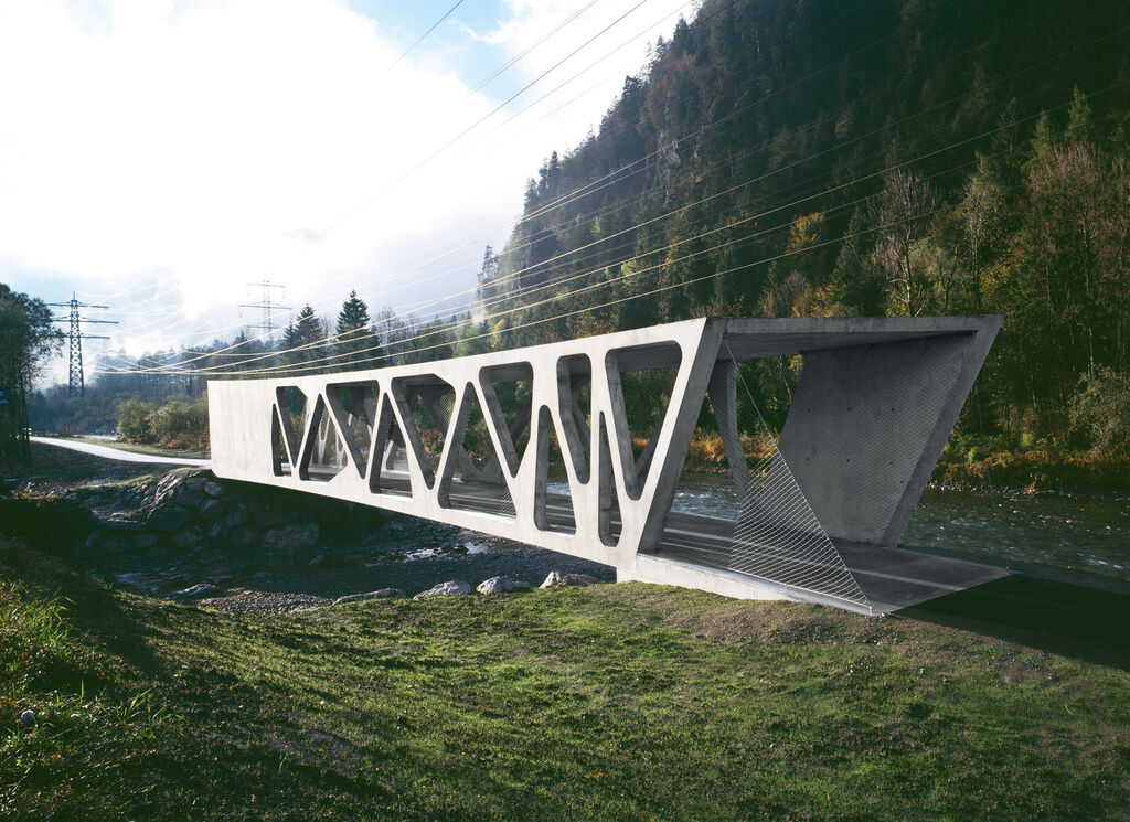 A few metres before the confluence of the Alfenz and Ill rivers in the Montafon valley in Austria’s Vorarlberg, a new concrete bridge structure spans the tributary and grants safe passage. A supporting structure was not possible which is why the option chosen was a covered bridge with load-bearing capacity on the lateral sides. Modelled on bionic principles, irregularly placed, diagonal tension and pressure rods form the bridge house.