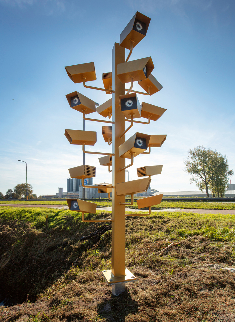 “All eyes on you” was developed for the province of Groningen, Netherlands, considering the high number of major accidents occurring there. Designed as a golden camera pole with twenty fake cameras, this installation at the intersection of art and design intends to contribute to a change in behaviour among road users. Each camera has an eye that, based on a lenticular technique, “follows” the road users as they pass. Research shows that these drivers are very aware of their environment and adjust their behaviour. In addition, the urban installation has now become a benchmark in the landscape along the route, reminding people to take care of each other.