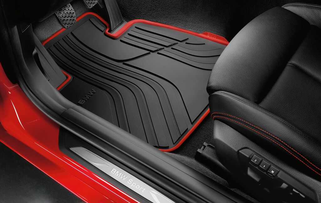BMW all-weather floor mats are dirt-repellent and water-resistant. They have been customised and preformed according to the interior trim of the car so that water is collected in special recesses. This helps ensure that the driver’s shoes remain dry. The floor mats are available with different-coloured edge seams corresponding to the newly designed BMW lines: Sportline is emphasised by the colour red, Urbanline by light grey and Modernline by beige.