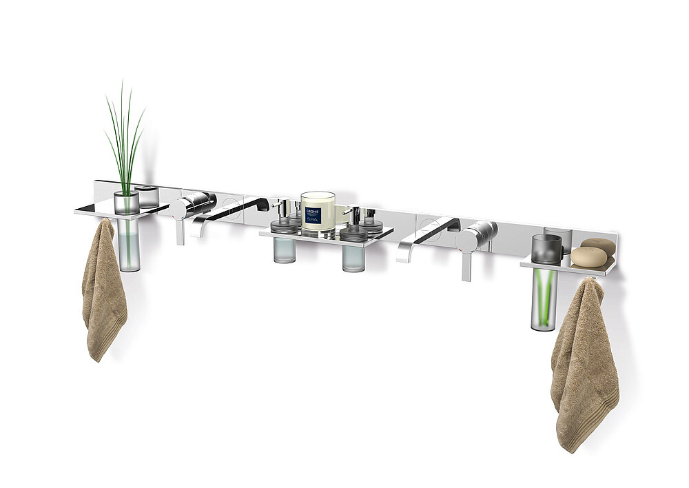 Aquastripe is an extension of the Allure collection that provides a practical and attractive storage solution in a harmonious form and function. At the origin of this idea was the need for more space to store cosmetics and bathroom products close at hand while finding a solution that would also provide a temporary resting place for watches and jewellery. The simple striped form incorporates all the Allure elements while the classic metal appearance enhances the whole wash basin area. The variable lengths and invisible wall mounting allow individual solutions for every bathroom.