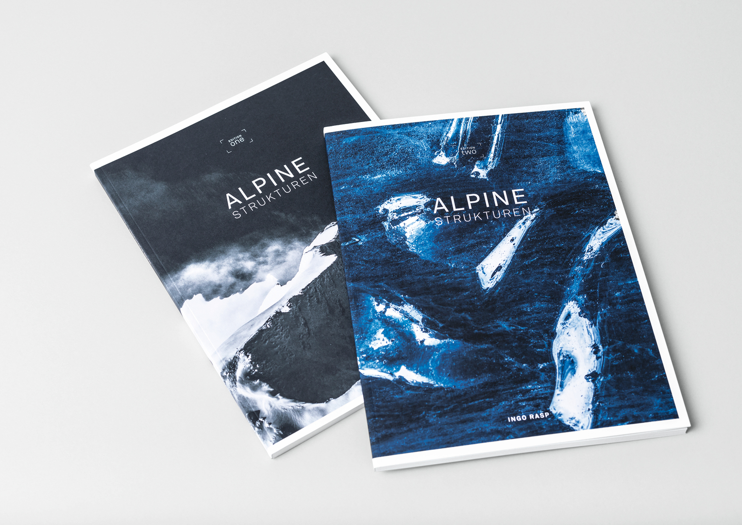 In order to showcase photographs from “Alpine Strukturen” (Alpine Structures), a project by landscape photographer Ingo Rasp, a series of fine-art catalogues with the same title was published. Their minimalist design provides a suitable framework to accentuate the artistic expression of the large-scale photos. The catalogues are divided into chapters, each presenting different views of the alpine environment, and introduced by specially composed lyrics which guide the viewer and underline the different moods. The natural tactile sensation given by the cover paper underscores the natural impression of the photographs. The title is emphasised by blind embossing, as are the lyrics on the flaps.
