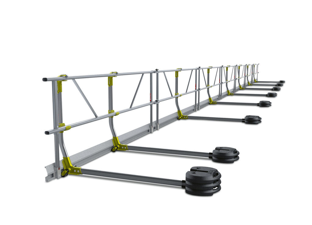 AluFix EVO fall protection is a temporary freestanding guardrail with counterweights which enables safe working on surfaces with an incline of up to 10 degrees. It meets the requirements of standard EN 13374-A and has the GS mark for tested safety. The product consists of a sturdy aluminium structure, which is mounted to form a continuous safety railing system, as well as of connection points with a self-locking clamping mechanism, which can be mounted without tools.