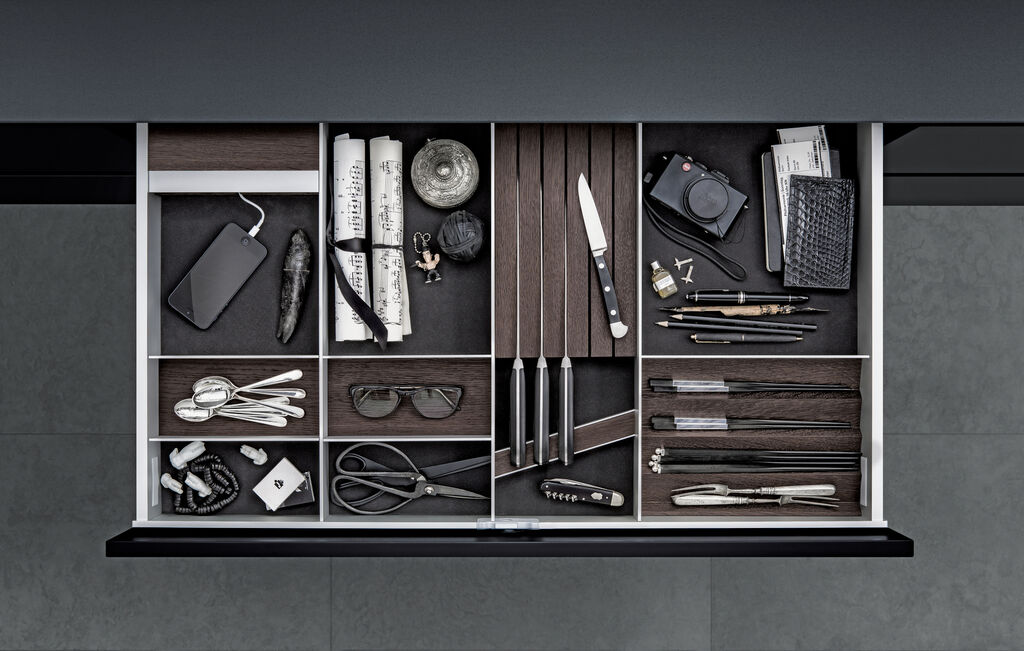 A particular feature of this interior accessory system of anodised aluminium is the so-called Flock2Block principle which is based on flocked inlay mats on which insert trays, cutlery and crockery can be placed with non-slip effect. The dark grey mats have a soft appearance, a pleasant feel and are easy to clean. Two basic and many additional elements allow for individualised layout of drawers and pull-outs.