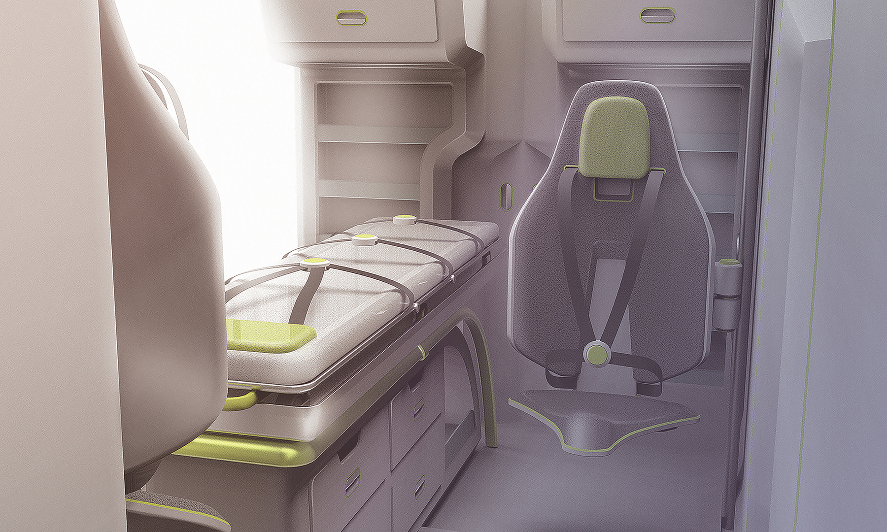 AM30 is a flexible and ergonomic interior architecture for an ambulance. This interior concept is designed such that it will fit within the existing dimensions of ambulances most commonly used in Scandinavia today. The opportunity for semi-autonomous drive mode is also explored – it considers and enables the possibility of both paramedics being required in the treatment of patients in life-threatening situations, while the ambulance finds its way back to the hospital without a driver The new optimised interior offers an unseen level of flexibility and possibilities to adjust and re-arrange the care environment, depending on the needs of patients and paramedics. The positioning of the stretcher in the ambulance can be switched, depending on the side of the patient that demands attention and care. The paramedics have three flexible seats to choose from, making it possible to attend to any part of the patient’s body and at the same time, reach for medical equipment without unbuckling the seat belt.