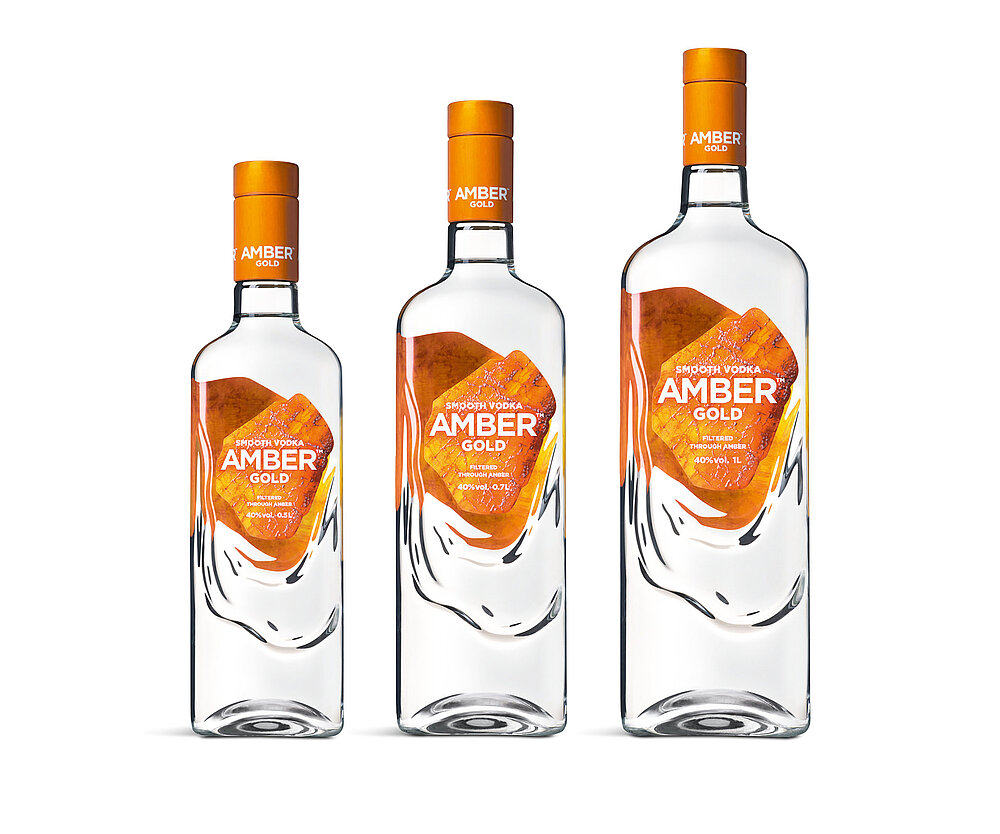 Amber Gold is a Latvian vodka filtered through amber. This innovative technology uses the highest-grade grain spirits to create a particularly gentle taste. The packaging design visualises not only the special production process, but also the beauty of amber. The bottle’s original contours were specially developed, and its gentle, flowing lines are reminiscent of sea-polished amber. The specially selected, smooth cork harmoniously matches the amber-coloured labels. The front label is decorated with lacquer, embossing and white foil, whereas the back label is printed on both sides.